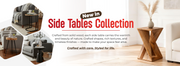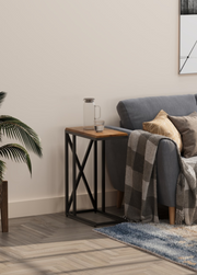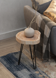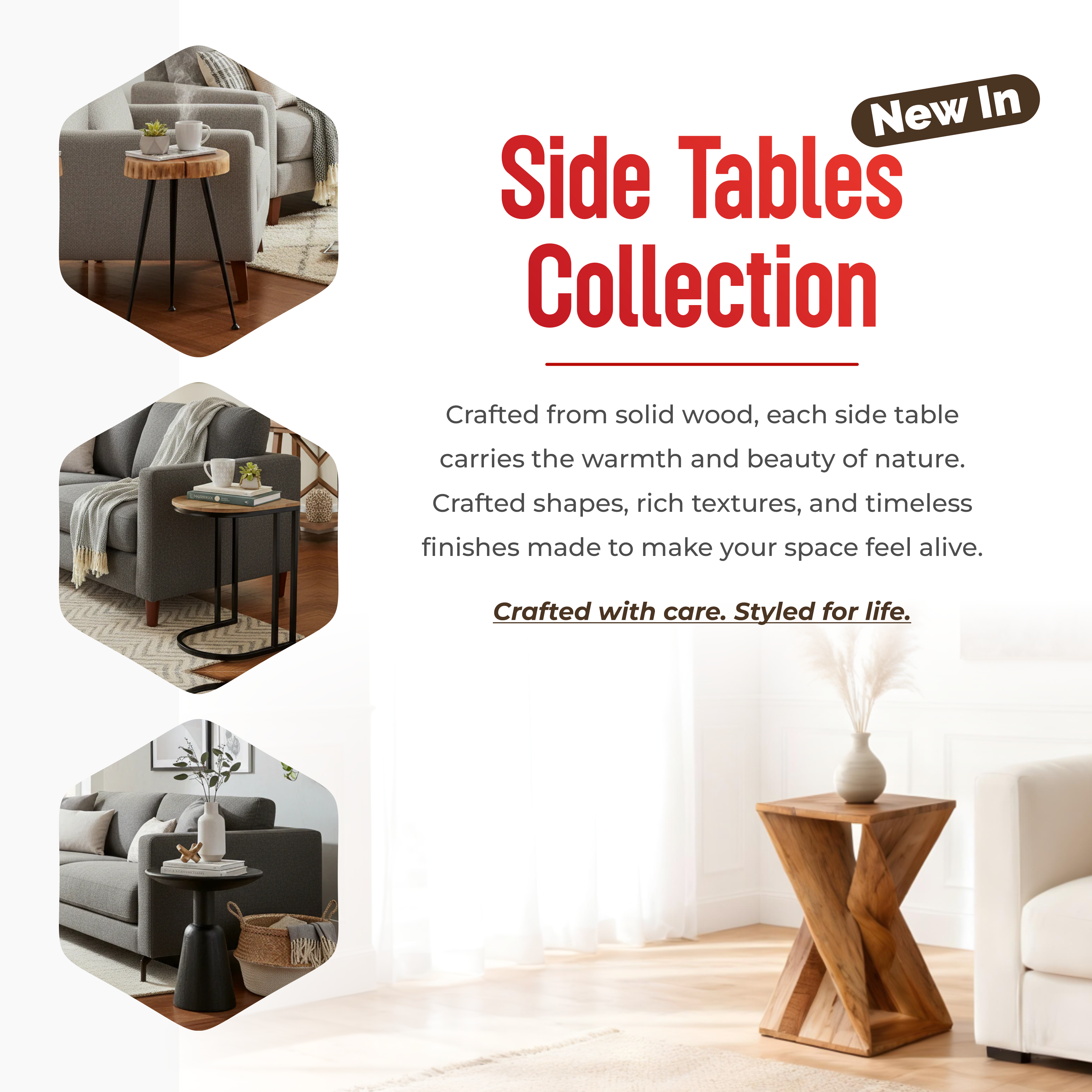 C-Shape Side Table features a live-edge wooden top and a black powder-coated metal base, blending rustic and modern style.