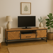 Acacia wood TV cabinet with parquetry pattern doors, sleek metal black powder-coated frame and base—stylish, durable, and functional storage.