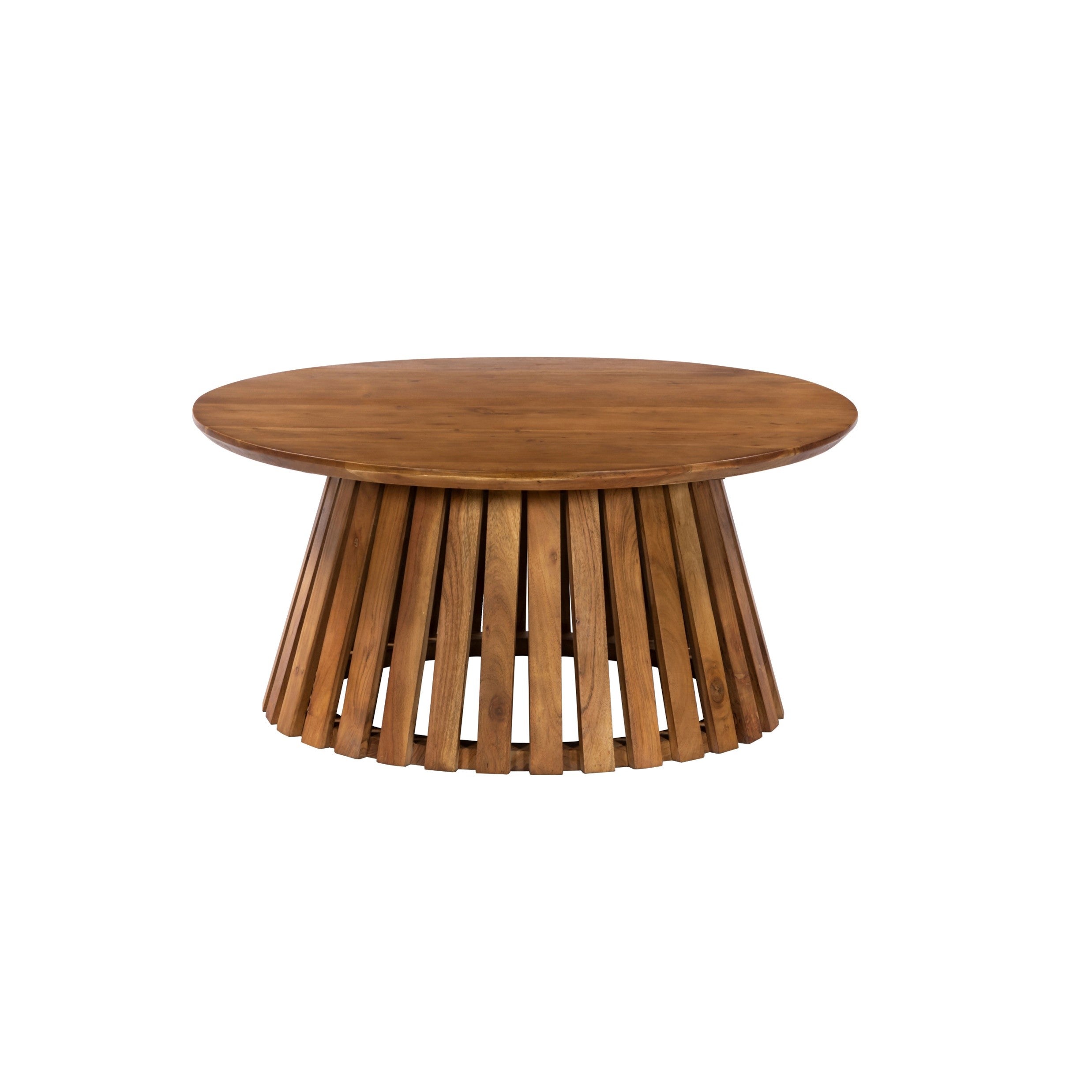 This solid acacia wood round slated coffee table features a rich stained finish, combining natural warmth with modern handcrafted design.