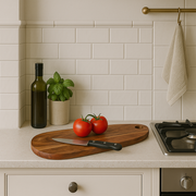 Egg-shaped acacia wood chopping board with finger hole—durable, stylish, and perfect for chopping, slicing, or serving in the kitchen.