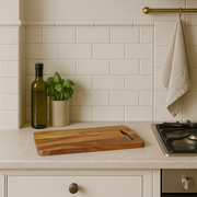 Acacia wood chopping board with handle—durable, stylish, and perfect for chopping, slicing, and easy handling in the kitchen.