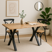 Live edge dining table with acacia wood top, natural or walnut finish, and black powder-coated X legs—bold, sturdy, and stylish.