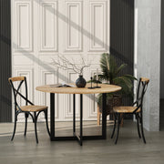 Round Swiss edge dining table with natural acacia wood top and black powder-coated metal legs—modern, durable, elegant, and space-saving design.
