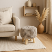 The Hand-Woven Cotton Pouf Stool features a round design with sturdy wooden legs, offering stylish, comfortable, and versatile seating for any space.