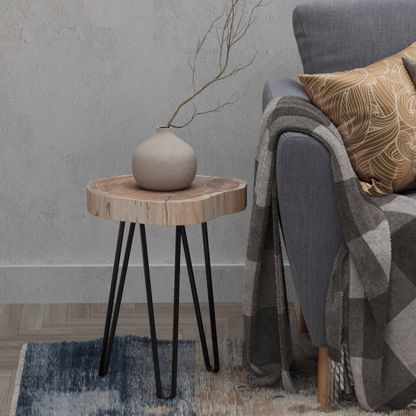 Description: Add a touch of natural elegance to your living space with this Acacia Wood Single Log Side Table. Crafted from a solid acacia wood log, each piece showcases unique wood grain patterns and organic edges, making it a one-of-a-kind statement piece. The sturdy metal hairpin legs provide a sleek, modern contrast to the rustic wood, offering both durability and minimalist charm. Perfect as a side table, accent table, or nightstand, this handcrafted piece brings warmth and style to any home decor.